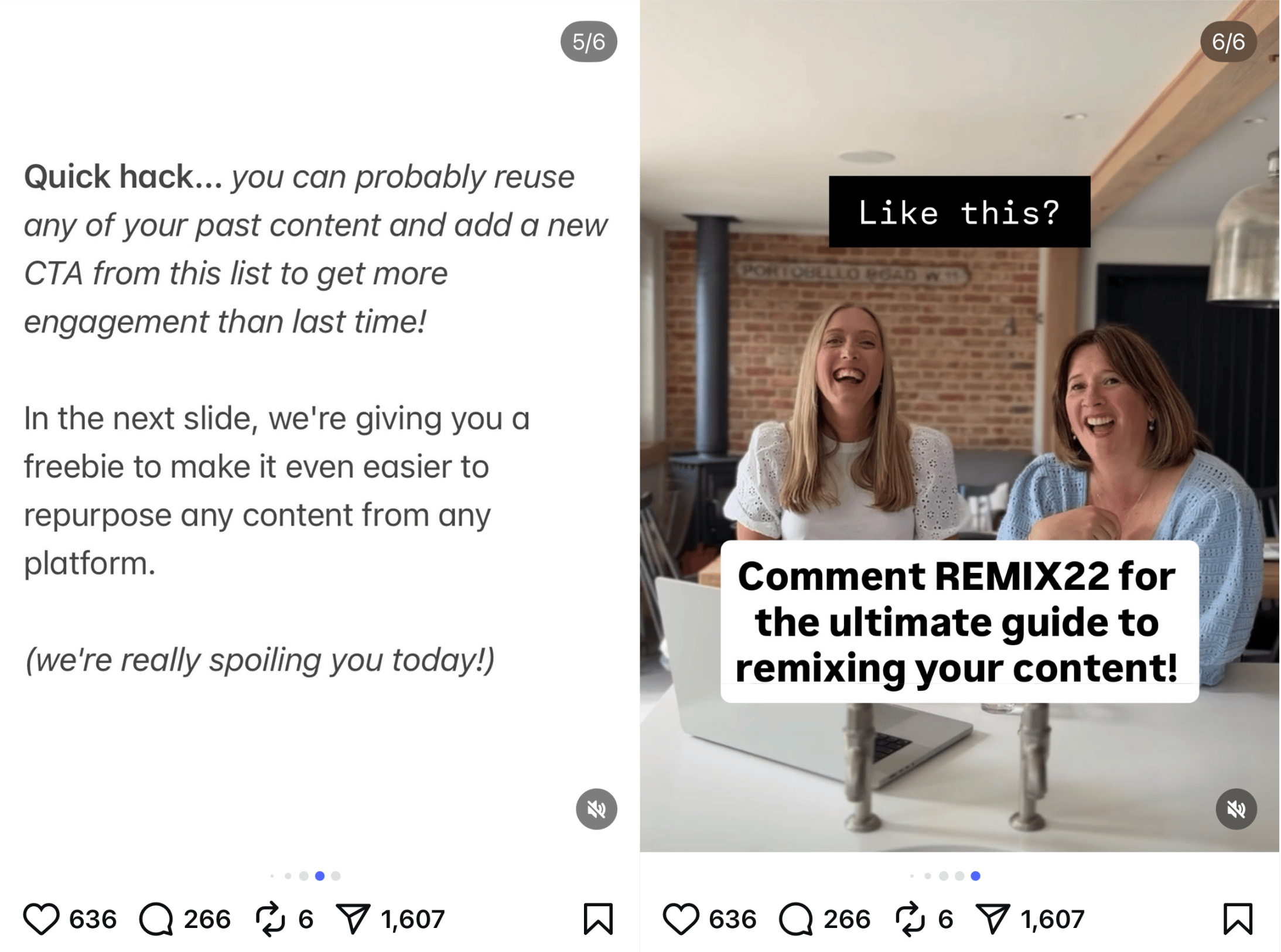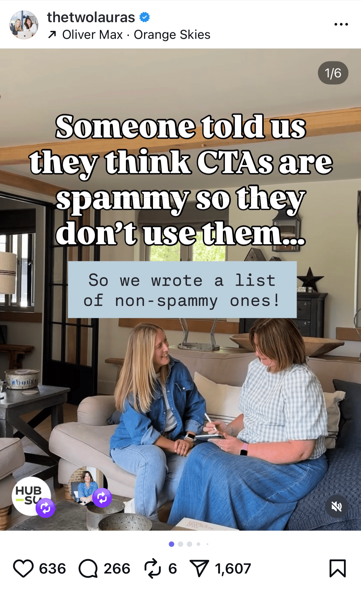 But we didn't stop there... By relating the content to something else that would help solve another common problem (reusing old content), the CTA to grab our related freebie became stronger because people understood how it was relevant. What you can't see from the vanity metrics is that over 100 people joined our email list from this single post 🥳 (maybe you're one of them?) If you want to try this in your next post, steal this formula:Someone told me [belief or problem that your audience has], so I [solve the problem] Once you've delivered on it, be sure to add your own CTA with something helpful they can save or use. Add a keyword to get people in your DMs to deliver the link if you're using a messenger bot. (Did you know Hubsy can do this for you?) Let us know if you're gonna try it! Tag us if you do 😊 Speak soon, Laura & Laura 💕 ~ The two Lauras