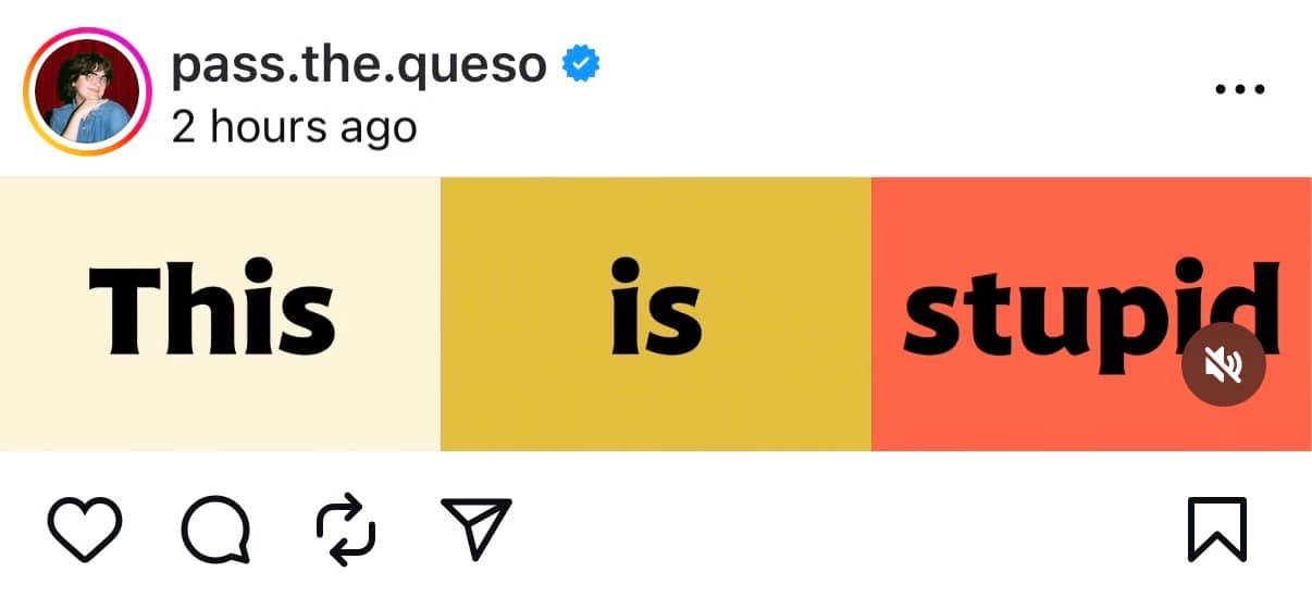We love a good trend. (note the word good) The Anthroplogie rock, this week's rapture... hell even 'Nothing beats a Jet2 holiday' was ok to start with. But not all trends are worth jumping on, and the new Instagram reel size that seems to be blowing up this week is one of those trends we're swerving! In case you missed it, people have started posting 5120x1080 Reels. They look like this 👇 There are 3 reasons you might wanna avoid following this trend...1) People watching without sound won't see your post!Captions take over the whole image on a post this size, so that the gorgeous graphic you spent hours on can't be seen because the captions from the music you painstakingly chose have covered it up. Like this 👇 2) Taking up LESS real estate on your audience's screen is a weird move.It means that while they might see your skinny post, if your caption isn't long enough to fill the screen, they might also have your competitors on the screen at the same time! Not ideal 3) Pattern disruptors only disrupt when they're unique... this already isn't!It's a new trend, but already the world and his wife are using it. So the likelihood of it having long-term success is slim to none. Remember how quickly you got bored with Jet2? Same! In marketing, it's always better to Zig when others Zag (or is it the other way around? 🧐) However... we did find one 5120x1080 Reel we really liked, from our pal Emelie at Pass The Queso... 🤣 (Emelie is hosting the November masterclass inside The Inner Hub - it's all about how you can get double the sales without writing twice the number of emails - if you're not already a member, you can join us here.) Let us know your thoughts on the crazy 5120x1080 Reels trend... will you still be using it? If you do, let us know if it worked for you! Speak soon, Laura x 2 ~ The two Lauras