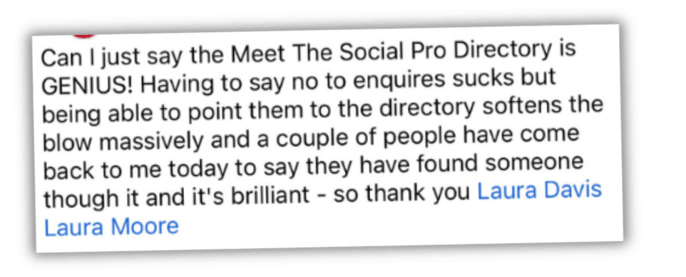 Most social media managers spend a lot of time and energy finding clients. Cold outreach. But what if clients were also COMING TO FIND YOU? Meet the (Meet The) Social Pro Directory.It's a publicly searchable, curated directory of professional social media managers. And it's exclusively for our members! When businesses, agencies, or brands are looking for a social media manager, this is where they come. They can search by specialism, location, and experience. And if your profile is there, polished and professional, you're in the running. Think of it as your always-on shop window. You set it up once, keep it updated, and it works quietly in the background while you're busy doing the actual client work. It's also brilliant for referrals. When a fellow member gets an enquiry that isn't right for them, maybe the niche isn't their thing, or they're at capacity, they point the business to someone in the directory. If you're in there, that someone could easily be you. The serious businesses (with decent budgets) aren’t scrolling through Upwork looking for you. They’re using specialist sites like this. And because our AI tool literally writes your SEO optimised listing for you, they'll be able to find you in no time! → Join the membership and set up your directory listing. ~ The two Lauras |